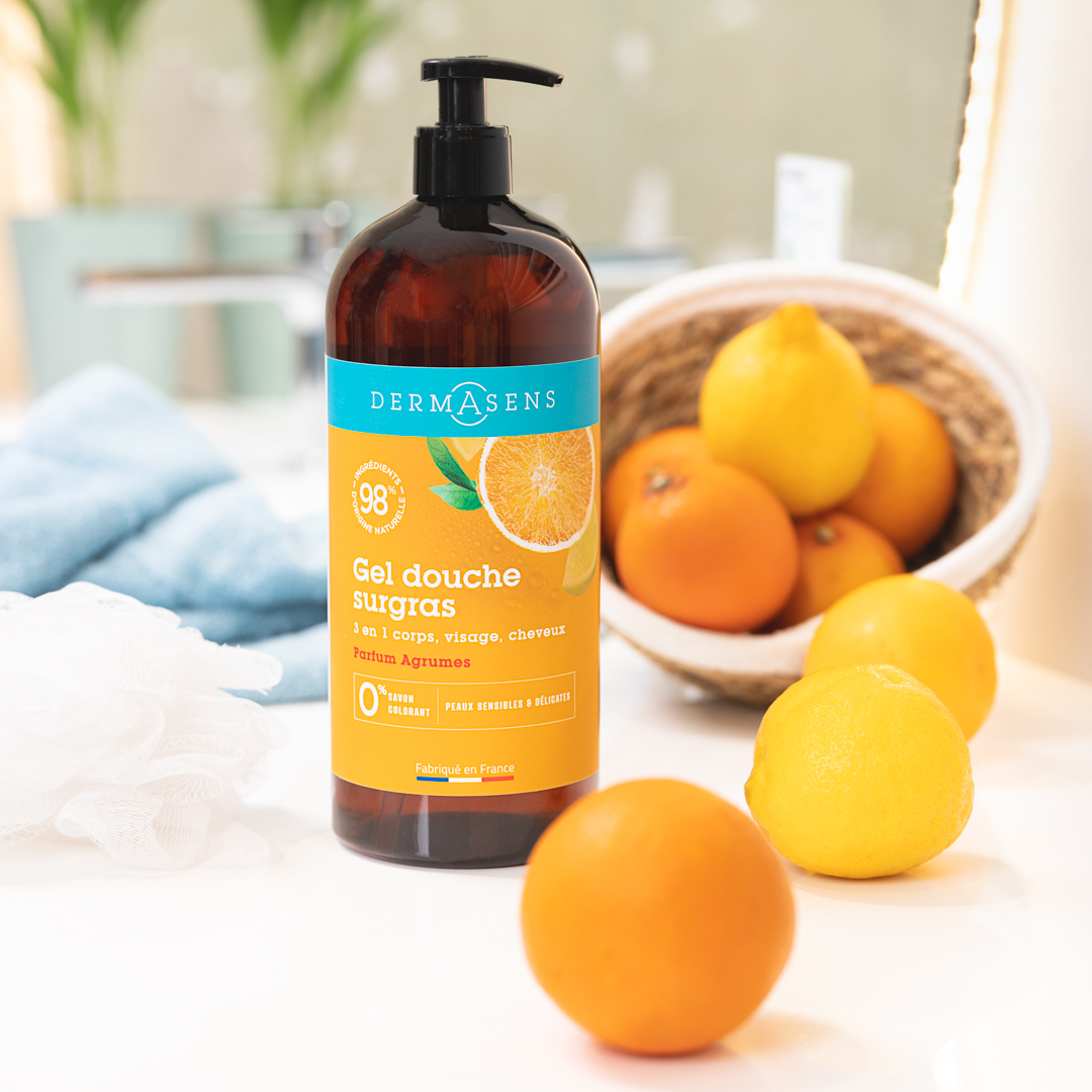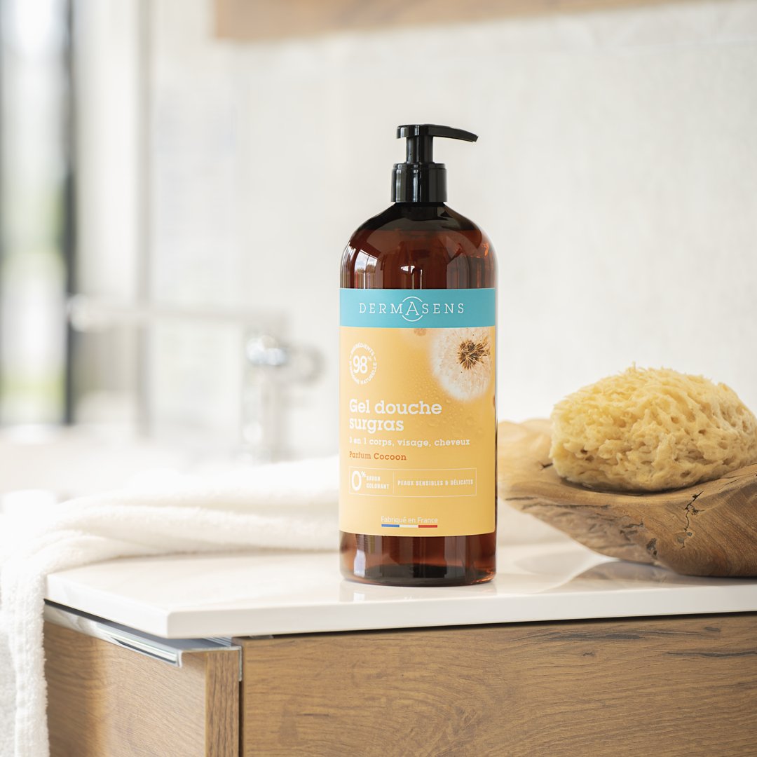 La notion de « surgras » signifie que le gel douche est enrichi en agents surgraissants. Ces agents sont le plus souvent d’origine naturelle végétale. Nous utilisons dans nos produits Dermasens, un dérivé de l’huile de Coprah, issu de la pulpe de noix de coco.