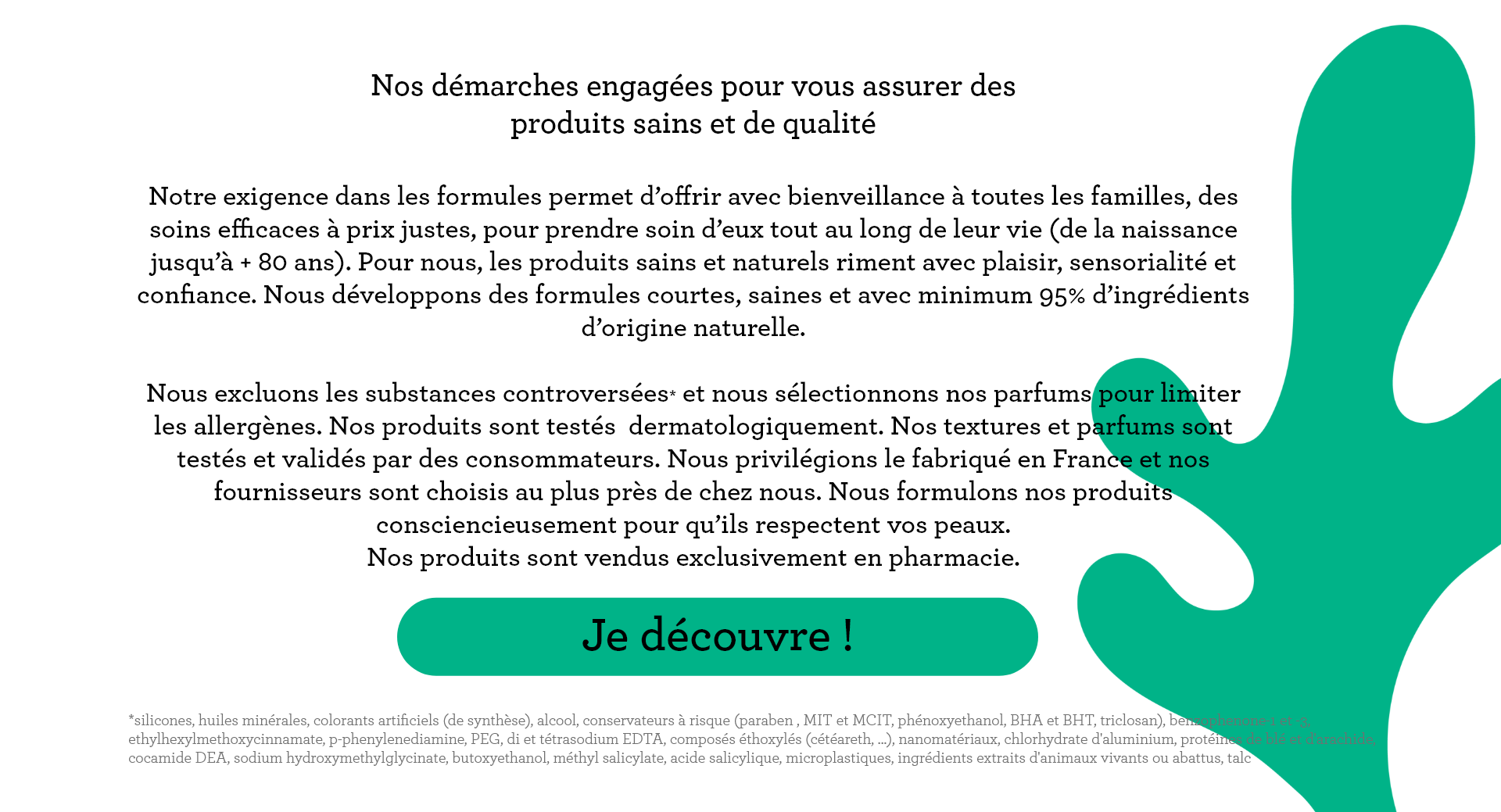 Sur tous nos emballages, nous nous appliquons à vous expliquer clairement les formules des produits pour vous accompagner au mieux. Nous vous présentons les démarches sur nos développements, via notre cahier des charges produits.